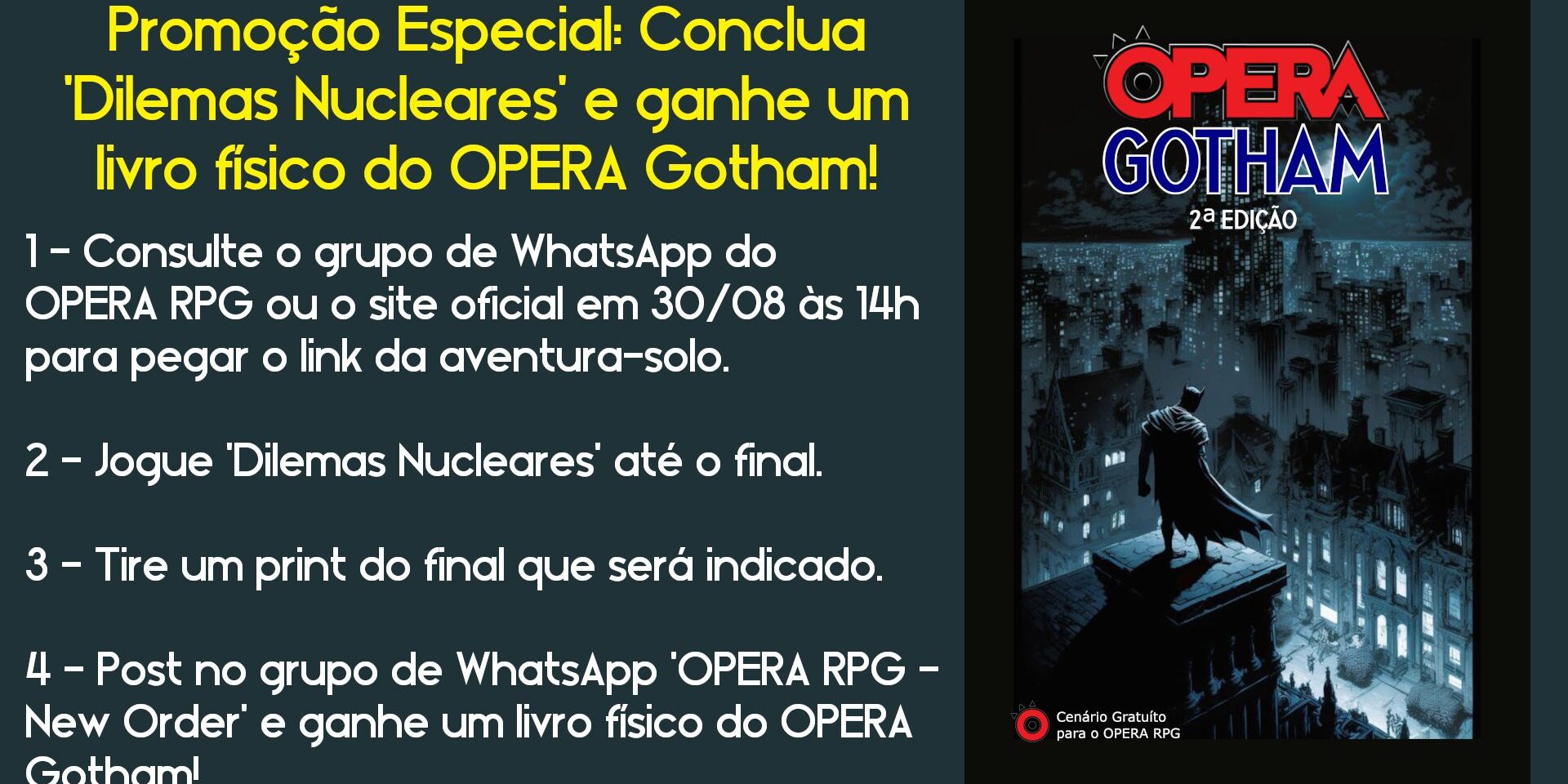 🧪 A equipe do OPERA RPG está lançando um desafio especial para os aventureiros solitários de plantão: o primeiro jogador a concluir a aventura-solo ‘Dilemas Nucleares’ e postar um print do texto final no grupo de WhatsApp do OPERA RPG será premiado com um exemplar físico do livro OPERA Gotham – 2ª Edição!